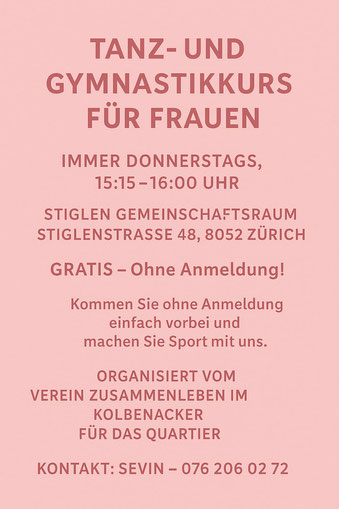Kosten pro Lektion: 10Fr. / Frauen mit Status F aus dem Quartier Seebach bezahlen pro Quartal 10 Fr.